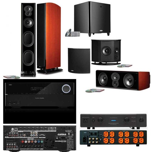 - You Receive 2 Polk Audio LSiM705 Towers Mahogony 1 Polk Audio LSiM706 Center Mahogony 2 Polk Audio LSiM702FX(Black Only) 1 Polk Audio DSW PRO 660 Sub(Black Only) 1 Harman Kardon AVR 3700 7.2 Channel Receiver-1 Furman Elite-20PF i Ultra-Linear AC Power Source 1 Home Theater Install Kit includes 100 Feet 14.2 Gauge Wire, 24 Banana clips, HDMI Cable, Optic Cable, Sub Cable.